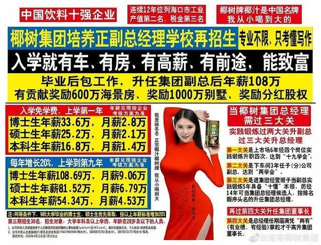 据澎湃新闻报道,椰树集团屡次因“擦边”营销引发争议。从直播间里身着紧身衣服,露出长腿,在各种神曲的带动下热舞,并展示鲜榨椰汁、椰子油、矿泉水等产品的丰满美女,再到身高一米八五的肌肉猛男们妖娆的表演画面,由美女与猛男组成的主播团,为了吸睛使出浑身解数。有网友认为直播风格有特点,但也有网友直呼“辣眼睛”,“一直行走在擦边最前沿!”另据福建日报报道,椰树集团曾多次因其营销方式被罚。其旗下的椰树集团海南椰汁饮料有限公司于2021年4月因“妨碍社会公共秩序或者违背社会良好风尚”,被通报批评及罚款40万元。当时,椰树集团发布过“培养正副总经理”的招聘广告。广告中,“入学就有车、有房、有高薪、有前途,能致富”字眼醒目。