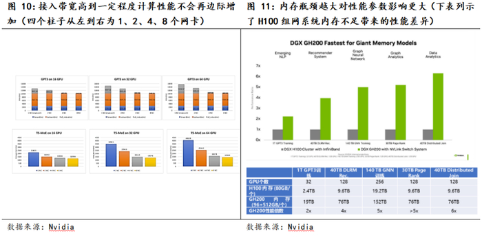 我们认为是内存瓶颈和联网方式是导致测试结果中性能差异最重要原因。1)内存瓶颈要素:性能图上,底部有一层小字,列举了不同的测试对应的GPU数量,我们计算了这些GPU对应的显存情况,结果表明Nvidia的测试结果普遍是在让H100达到内存瓶颈,而GH200不达到瓶颈的角度去测算。2)网络连接要素:此外,传统DGX H100集群是采用Infiniband组网,而本次DGX GH200是采用Nvlink组网。NVLink是局部极高带宽的通信,DGX GH200已经扩展到了整个256个芯片级别,可以实现无阻塞,单个GH芯片接入带宽可以有3.6Tb/s;而如果选用Infiniband连接,单个H100芯片接入带宽(1个Connect-X 7)仅为400Gb/s,性能差并不与网络差形成正比关系,因为只要网络是充足的,再扩大网络是不会线性的再继续提升。