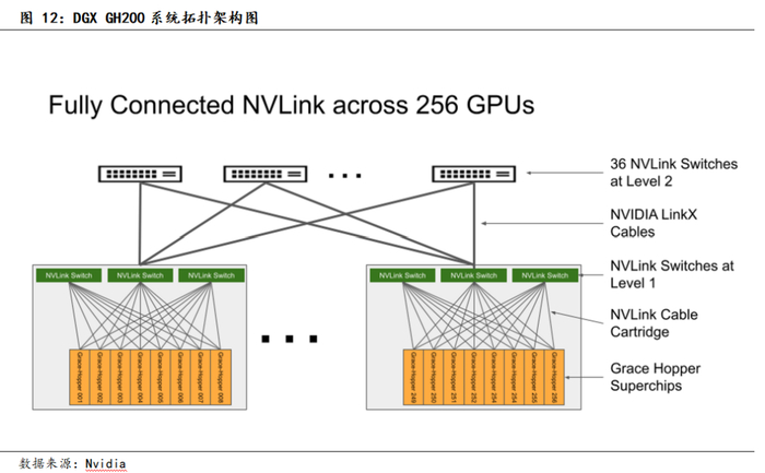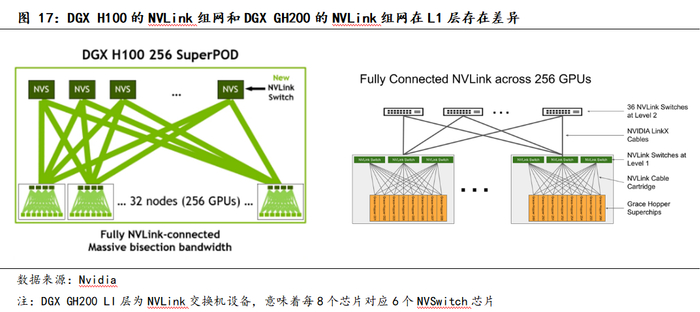 我们认为DGX GH200 L1层可以实现无阻塞、1:1的传输,主要原因是相较DGX H100结构8个GPU对应4个NVSwitch的架构,最终L1层采用了2:1的收敛比。而这里采用了8个GH芯片对应6个NVSwitch芯片的架构, 6个NVSwitch芯片可以接收6*12.8Tb/s=9.6TB/s,大于芯片层过来的3.6TB(8*450GB)的2倍,可以实现1:1的传输。而DGX H100由于仅有4个NVSwtich芯片,可以支撑4*12.8Tb/s=6.4TB/s,小于8个H100带来的3.6TB的2倍,因此需要做2:1的收敛来满足流量设计的要求。