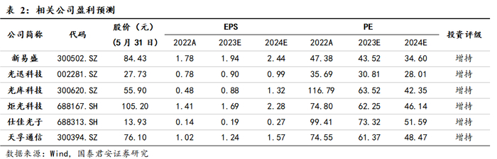 超算中心趋于一个整体,光互联重要性快速提升。Nvidia CEO黄仁勋在大会上反复提到,未来的超算数据中心将表现的越来越像一个超级计算机,正如这次DGX GH200系统可以将256个GPU无缝连接,使其性能等于一个超大号的GPU。DGX GH200里面采用了242.4公里的光纤,证明在高速互联领域,对光通信器件、模块的应用将大大增加,光进铜退的趋势在服务器外部的层级趋势越来越明显。