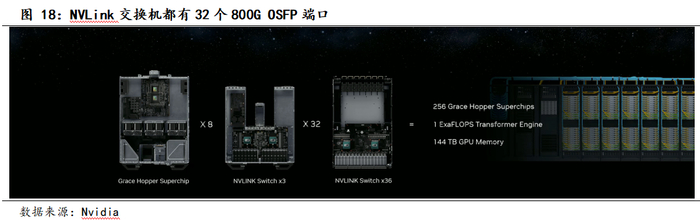 本章测算仅考虑NVLink网络,是因为Nvidia通常会采用NVLink和Infiniband的架构,两者的定位不同。其中,NVLink为特定系统或节点内部GPU与GPU连接的通信方式,速率非常高,目前通过NVLink 交换机可以扩展至最多256个GPU互联。Infiniband网络为通用高性能网络,既可以用在GPU之间的通信,也可以用在CPU之间的通信,可以快速扩展到数千至数万节点。虽然DGX GH200也配置了Infiniband的组网方式,英伟达自身要用最新发布的Spectrum-X 51.2T 64*800G的交换机将4个DGX GH200系统连接起来,但整体Nvlink的互联带宽和光模块端口数占大头,同时Infiniband组网结构未有细节,暂不考虑。