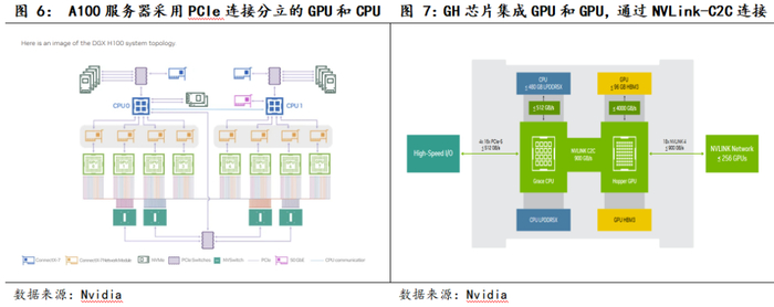 1)H100与GH200芯片本质是分立GPU和集成CPU+GPU的关系。H100是分立的GPU,因此它和CPU的连接需要PCIe。而GH200芯片是集成了CPU和H100 GPU,两者可以用超高效的Nvlink-C2C连接,导致单颗H100芯片和GH200芯片可高速访问的存储容量不同,组网形成集群后可高速访问的存储容量也不同,最终对应的应用场景不同;