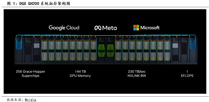 事件回顾:Nvidia创始人黄仁勋在台北Nvidia Computex 2023研究中宣布发布DGX GH200产品,该产品通过将256个Grace Hopper超级芯片(下称GH芯片)连接成一个新型AI超级计算机,其GPU存储容量144TB,在历代里面最高,同时可以提供1 EFlops的FP8 Transform Engine算力。