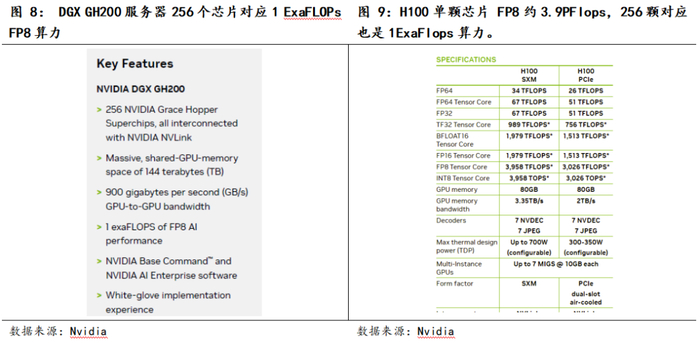 我们认为,GH芯片与H100芯片在FP8算力上没有差异。一方面,GH芯片部本来即由一个H100和CPU组成;另一方面,单个H100的芯片算力参数和单个GH芯片的算力参数是一致的。如下图所示。