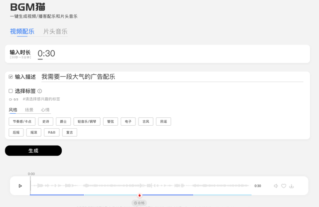 仅输入时长和描述,BGMCAT即可快速生成对应的音乐