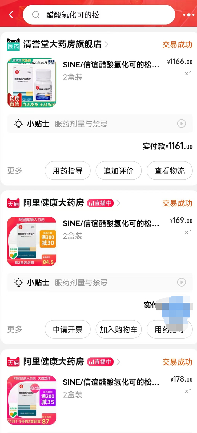 ↑吴芳购买20mg*100片(共2瓶)醋酸氢化可的松片价格前后对比,最上面的订单为今年3月购买,下面两个订单为去年涨价前购买。