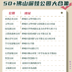 🌈亚洲艺术公园、文华公园、绿岛湖公园、王借岗森林公园、佛山青年公园、半月岛湿地公园、中山公园、石湾湿地公园、智慧公园