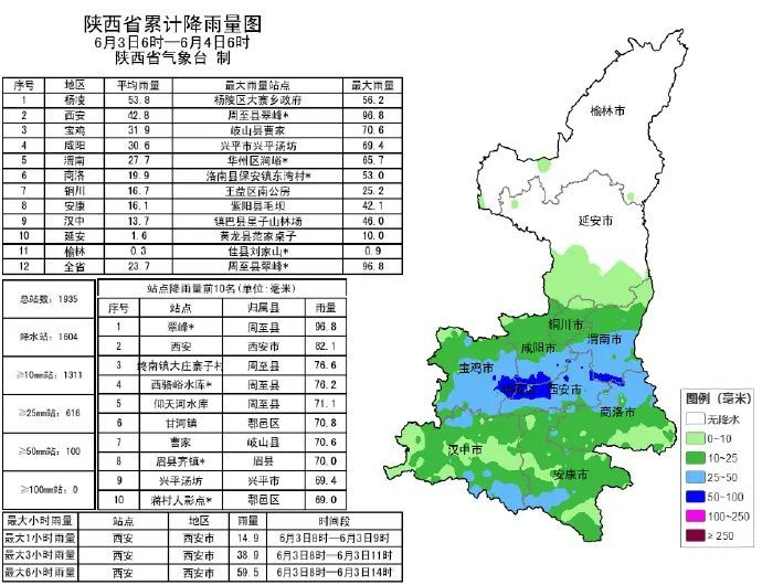 6月3日06时—4日06时,全省共有95个区县1605个监测站出现降水,其中宝鸡东南部、西安西部、咸阳南部、渭南南部等地共出现100站暴雨。 最大周至翠峰站96.8毫米,全省共出现515站大雨,696站中雨,293站小雨;西安82.1毫米,城区最大82.1毫米(西安西安站)。全省小时雨强大于等于10毫米共33站次,最大西安站6月3日9时雨强为14.9毫米。