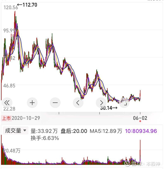 6、以下为九号公司上市至今的日K线图:(1)目前股价已在底部区域横盘长达7个月;(2)上一个交易日,成交量急剧放大,可怕至极,是历史第二高的成交量,仅次于上市首日的成交量