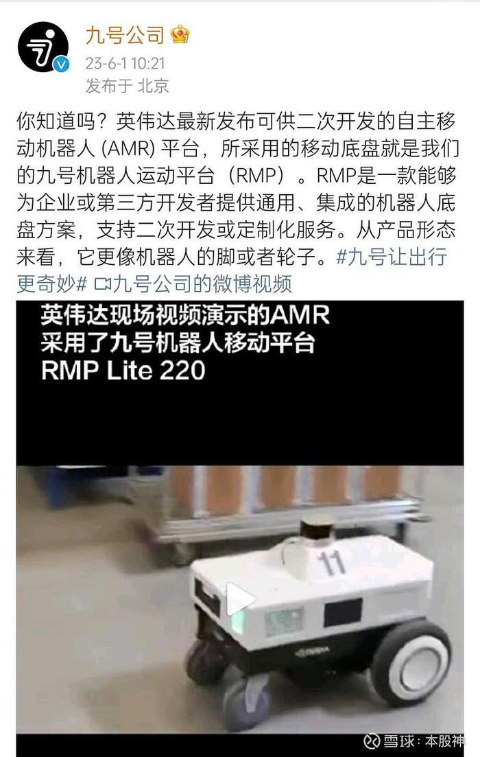 3、6月1日上午,九号公司突然公开宣布,英伟达的机器人底盘是由九号公司提供的