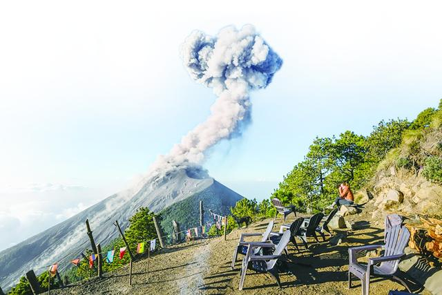 不过,要想体会这样一生难得一见的“大场面”需要付出不小体力。为了满足游客观赏需求,当地旅行社在阿卡特南戈火山上修建了宿营地。要到达这些宿营地,需要从海拔约2400米的山脚爬至3700米的山腰。很多路段比较陡峭,就算是徒步经验丰富的老手,也得花上六七个小时。好在沿途风光独特壮美,尤其是火山上独有的地貌和植被让笔者的整个旅程大开眼界。笔者发现,越接近山顶,土壤越是焦黑,一排一排被火山灰洗礼过的大树光秃秃的,却笔直坚挺,好像在无言诉说岁月的苍凉。黄昏到达营地后,生起一堆篝火,大家围着火堆捧着咖啡,在对面弗戈火山的每一次巨响中欢呼。入夜后,岩浆的喷射更加夺目,火光将一整片天空染成了绯红色。距离弗戈火山不远的安提瓜市区,夜晚成了最美丽的背景板,喷发的火光衬托着不远处的城市灯光,自然力量与人类文明相映生辉。