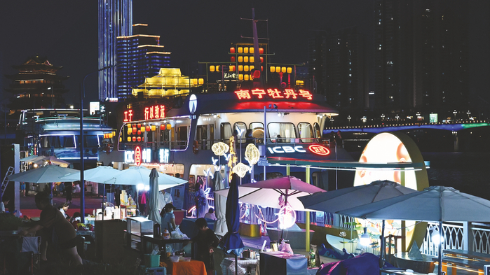 在位于青秀区的东盟文化和旅游片区,汇聚艺术、娱乐、展览、体育休闲等多种业态,这里有以中国东盟南宁国际步行街等为代表的特色东盟文化街区,夜经济活力满满,吸引年轻游客聚集。