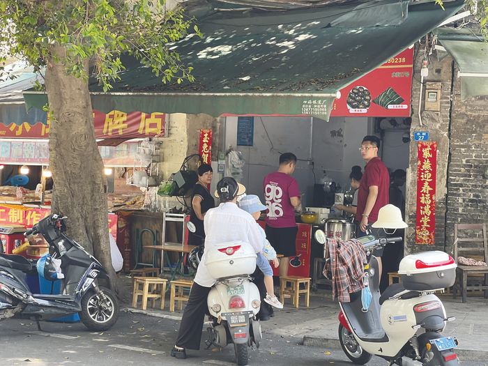 在埌西夜市,不少食客围在糖水铺前仔细浏览菜单,老板根据客人的需要用勺子从桶里舀出各种糖水。一旁的酸品摊老板询问客人需要放多少辣椒粉,得到回答后熟练地搅拌起来;不远处的一家凉拌菜店铺,客人夹出想吃的凉拌菜让店员称重。