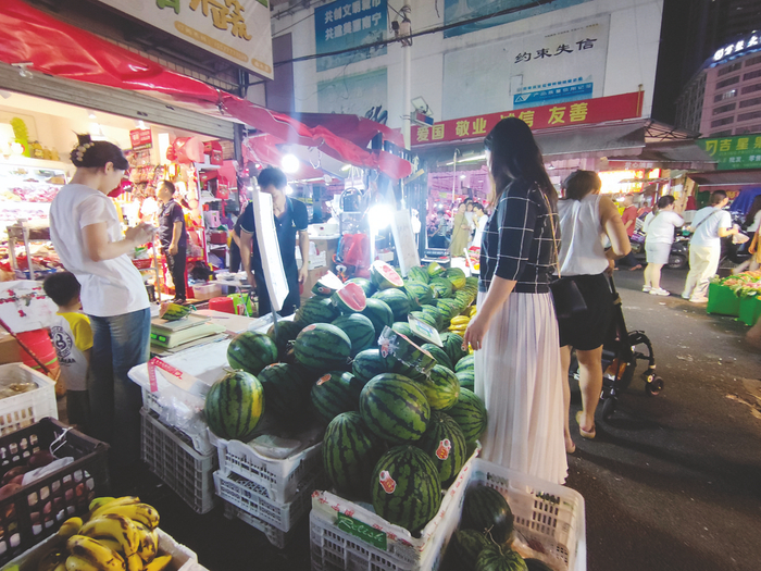 下午5时,记者来到淡村市场,不少水果摊主正卖力吆喝售卖西瓜、荔枝等当季水果。一名摊主拿出一个大西瓜对半切开,肉红皮薄,汁水饱满,卖相诱人,立刻就被人买走。