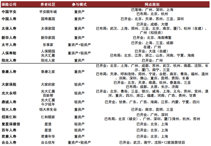 ► 轻资产模式:与第三方养老社区开展合作,保险公司不直接控制养老社区也不参与运营,资本投入和运营管理能力方面门槛较低。基本模式:与养老机构合作/租赁已有物业进行改造→保单保费挂钩入住资格→保单红利/给付金支付社区开销。保险公司不参与养老社区的开发和运营,而是与养老机构合作,向特定险种累计保费达标的客户赠送养老社区优先入住名额。