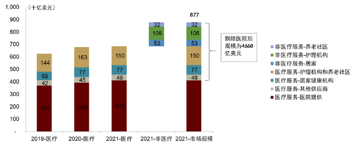 图表3:我们测算2021年美国养老服务市场规模达8770亿美元(剔除医院直接提供的服务为4660亿美元)