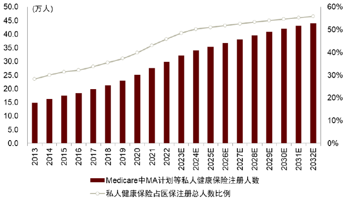 注:私人健康保险中约97%为MA计划,2023-2032年数据为美国CMS预测值资料来源:美国CMS,中金公司研究部