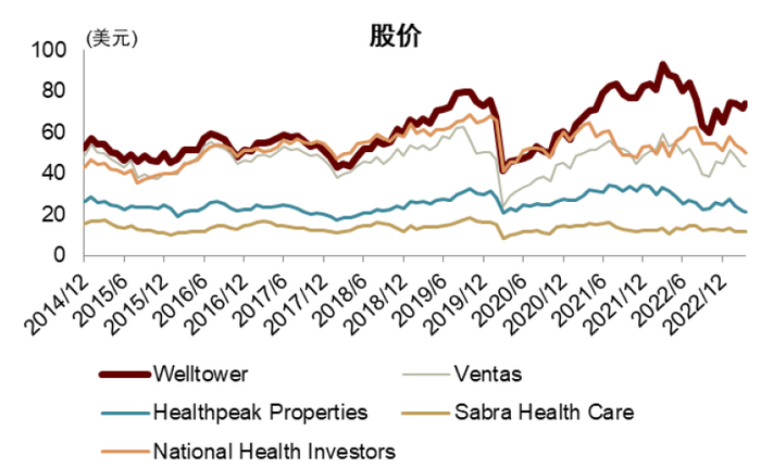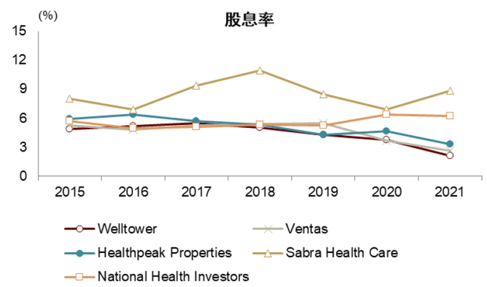 图表12:美国养老医疗REITs维持较高股息率的同时股价温和上涨或保持稳定
