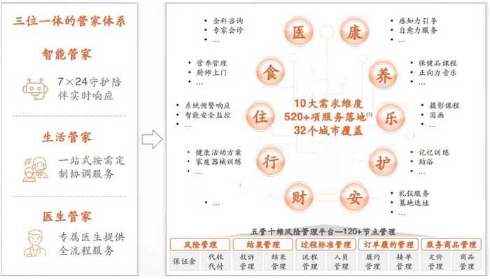 基本模式:与各类服务机构合作提供丰富的养老服务。保险公司对达到一定缴费门槛(数十万或百万元)的用户通过合作网络的供应商提供免费或收费的多样化服务,包括智能管家、家政服务、家庭医生、重疾专案管理、家庭适老化改造、起居照料、老年大学服务等服务。