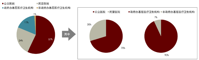 图表15:截至2021年,我国医疗床位中75%来自公立医院或政府办基层医疗机构,且床位供给以医院为主,尚未建立起多层次的医疗服务体系