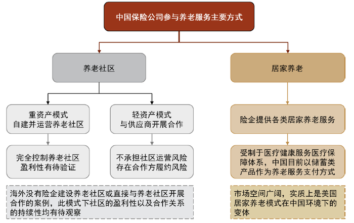 中国保险公司参与养老服务的方式包括养老社区和居家养老: