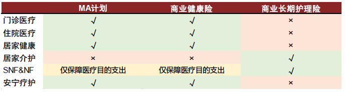 注:Medicare包含传统Medicare和Medicare advantage plans(MA计划),传统Medicare由美国CMS运营,MA计划由经CMS批准的保险公司运营。商业长期护理险包括有长期护理条款的寿险