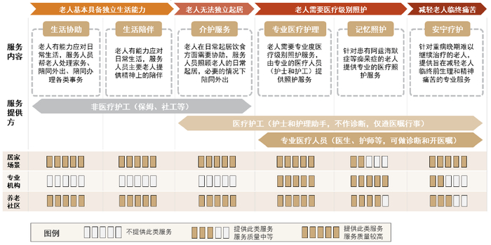 1. 受可得性限制,表中使用2017~2018年数据。居家健康服务机构仅在居家场景下为老人提供服务,安宁疗护服务大多在居家场景下提供(服务方包括居家健康机构、医院、护理机构等),日托提供居家和机构的非医疗服务,护理机构提供机构内的医疗和非医疗服务。