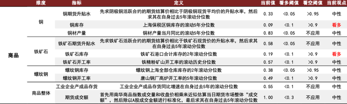 当前商品左侧择时体系为看多信号。截至最新时点,当前商品左侧择时体系中有2个指标发出看多信号,其余指标维持无观点状态,我们认为商品市场整体处于过冷状态,未来大概率出现情绪修复所带来的价格上行。
