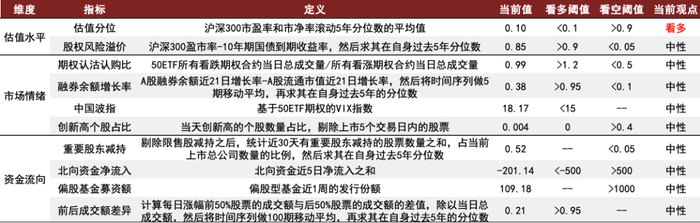 当前股市左侧择时体系为看多信号,估值已具有较大修复空间。截至最新时点,当前股市左侧择时体系中有1个指标触发看多信号,为估值维度的估值分位指标,其余指标维持无观点状态。我们认为股市当前已处于估值较低状态,未来存在较大的估值修复空间。