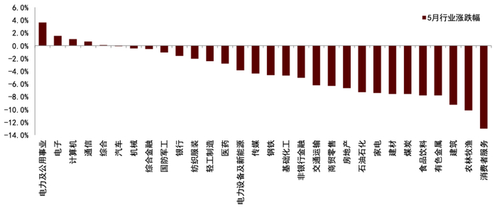 电力及公用事业行业在5月份表现相对优良,涨幅为3.6%,显著领先于其他行业;其他在5月取得正向收益的行业包括电子、计算机、通信和综合行业。大部分行业在5月的表现偏弱,其中收益相对较差的行业包括建筑、农林牧渔、消费者服务等,月度分别下跌9.3%、10.1%和13.0%。