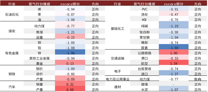 ►中观景气度方面,钢铁、石油石化和煤炭行业处于低景气阶段,在本月的模型中有额外扣分;汽车行业处于高景气状态,在本月的模型中有额外加分;其余行业在中观维度上没有得分调整。