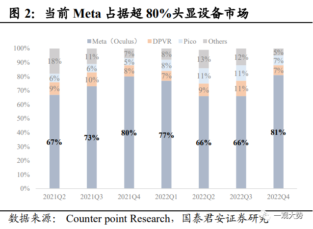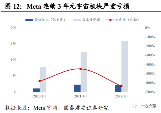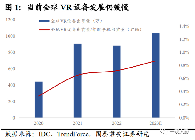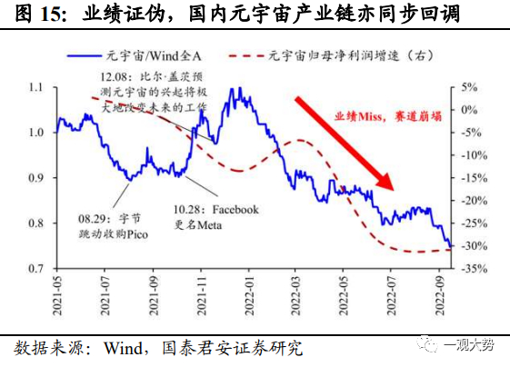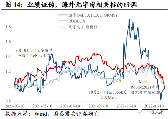 2021年元宇宙主题行情:始于巨头入局和VR设备出货超预期,止于业绩表现的证伪。2021年10月,以Facebook押注元宇宙为契机,市场掀起元宇宙主题行情,短时间内国内外多家互联网科技巨头相继宣布入局。国外方面,微软推出 Mesh for Team,切入元宇宙办公赛道,Google计划重组 Google Labs,专注于研发包括 AR/VR 等具备长期发展潜力的设备;国内方面,字节相继投资光舟半导体、众趣科技、梦途科技,阿里巴巴达摩院宣布增设 XR 实验室。与此同时,疫情期间电子娱乐需求激增,VR头显设备全球出货量超市场预期,21年Q3-Q4全球出货量增速超60%,连续两个季度保持稳定高速增长态势。巨头的纷纷入局以及设备端销售超预期之下,元宇宙行情开启。而后续缺乏业绩验证也导致了行情仅停留在概念阶段,主题行情持续时间较短,触顶后热潮随即退却。其一,2022年2月Meta和Roblox 相继披露年报,其中Meta元宇宙业务板块连续两年亏损严重,业绩表现不及预期挫及市场信心,引发投资者对元宇宙前景的担忧,年报公布当日,二者股价下跌超20%。其二,2022年疫情全面放开后,“宅经济”概念退潮,全球VR设备出货量大幅下滑超预期。整体来看,概念超前、缺乏现象级硬件支撑、生态不成熟等因素是行情无法向业绩验证过渡的重要原因。