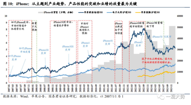 iPhone:从主题到产业趋势,产品性能的突破和业绩的放量最为关键。回顾苹果引领智能手机风潮的历史,从初代iPhone发布开始,苹果股价总体上持续获得可观的超额收益。在iphone手机全新型号发布前,市场通常会对新品的产品力创新计入较高预期,若产品最终销量符合预期,股价更可能保持横盘,若销量仍超预期,股价将进一步上涨。具体到型号上看,初代iPhone发布前,苹果超额收益持续走高,但由于销售表现一般,股价开始回撤,直到iPhone3G验证了智能手机放量的逻辑,随后四年里,苹果股价持续跑赢标普500。此后iPhone4、iPhone4S的发布,以及iPhone4S销量大涨,无论是前期的产品力预期还是后期的销量验证都使得苹果公司实现了明显的超额收益。但当iPhone5的表现不及市场预期后,苹果的超额收益就出现了明显回调。不过在国内国产机逐步兴起,智能手机加速渗透的过程中,A股电子元件板块仍能持续获得超额收益。