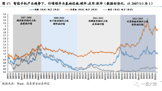 智能手机发展沿着3G建设→硬件迭代→应用爆发,行情顺序同步表现为基础设施端-硬件端-应用端-软件端。2008年,3G等基础设施建设快速完善,随后iphone3G-iphone4-iphone4s等系列问世,A股苹果供应链相关公司受益,此后2012年前后小米、华为荣耀等销量大增,国产千元机时刻来临,手机出货量迅速增加,硬件端加速迭代,带动相应消费电子板块行情。而伴随着硬件性能的成熟以及智能手机的加速渗透,下,微信、支付宝等爆款APP出现带来内容端的持续爆发,手游、短视频、社交、购物等内容应用迎来爆发式增长,此时传媒和计算机板块开始迎来超额收益。