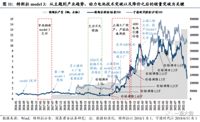 特斯拉model 3:从主题到产业趋势,动力电池技术突破以及降价之后的销量突破为关键。尽管model3早在2016年4月即发布,第一辆model 3早在2017年即亮相,但特斯拉股价反应平淡,真正的行情爆发在2020-2021年,核心在于动力电池技术的突破以及降价之后的销量突破。2020年动力电池技术的突破带动了新能源车产品力的抬升,此时特斯拉股价开始明显拔升,可以发现宁德时代和特斯拉股价亦同步表现。而后续凭借各国新能源政策补贴、特斯拉在中国建厂量产优势和对零部件厂商议价能力增强,特斯拉成本大幅下移,在2020和2021年多次降价,消费者接受度逐步提升,凭借model 3的高性价比,公司产品快速放量,股价相应获得了明显的超额收益。