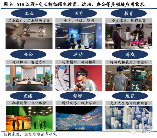 上至场景应用:MR交互创新激发内容端新的探索,内容端生态有望重塑。一方面,苹果作为消费电子行业龙头,在软件及系统开发方面同样具有标杆作用。根据VR陀螺,软件生态方面MR可安装iPad应用程序、内置3D版FaceTime通话等,这意味着传统成熟应用将拥有新的搭载平台和应用空间。另一方面,VR具备沉浸、多维交互等特点,MR的推出将革新游戏玩法和观影新体验,同时进一步催生在教育、运动、办公、展览等多领域应用需求。根据VR陀螺,苹果亦已着手为产品开发VR锻炼以及VR冥想服务