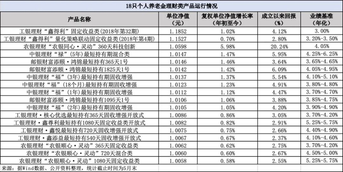 就不同产品来看,18只产品表现各有不同,收益情况亦有更新。据Wind(万得)数据,截至5月末,个人养老金理财产品的净值均在“1”之上。