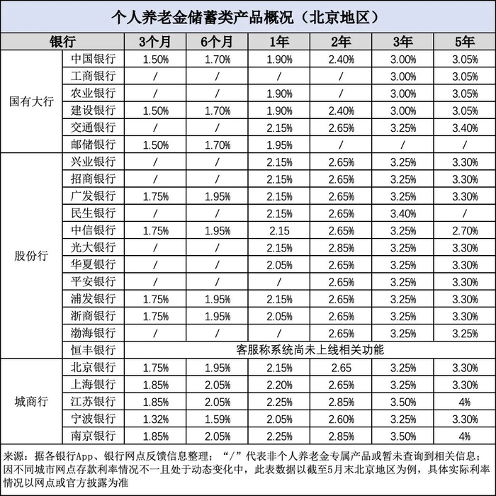 由于不同城市网点存款利率情况不一且处于动态变化中,本文以截至5月末北京地区的情况为例,如下图所示,在各大银行为个人养老金账户提供的存款产品中,国有大行5年期年化利率多为3.05%。