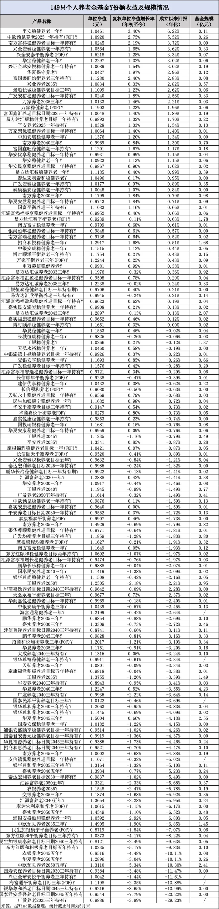 Wind数据显示,截至5月末,149只个人养老金Y份额中,超过一半的产品从年初以来复权净值增长率为正,59只成立以来年化回报为正。其中,平安稳健养老一年Y、中欧预见养老2025一年持有(FOF)Y、南方富祥稳健养老目标一年持有Y分别以6.22%、5.52%和3.72%的年化回报率位列前三。