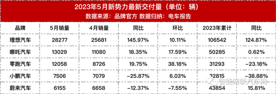 6月1日,造车新势力陆续公布2023年5月成绩单。从各大品牌公布的交付销量数据来看,理想汽车继续稳坐造车新势力新车交付第一位,达28277辆,再次刷新销量单月销量新高,蔚来汽车和小鹏汽车均低于万辆,其中蔚来汽车为6155辆,小鹏汽车为7506辆。此外,零跑汽车交付12058辆,哪吒汽车为13029辆。
