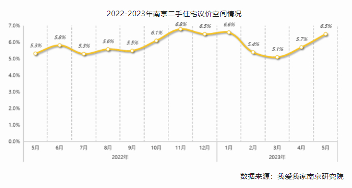 “量价齐跌,这是近期南京二手房市场的鲜明特征”,前述中介公司河西门店的冯女士表示,“红五月”的二手房挂牌行情依然稳定,从她所在门店以及同行的业内数据显示,河西奥体、河西南等热门区域的挂牌节奏并没有太大变化,而房主报价则“理性”得多,过去曾一度飙升至“7”字头的西堤国际、光明城市等楼盘,目前报价均在53000元-58000元/㎡左右,而买家态度仍不够积极,认为房价尚有下探空间,因此观望氛围较浓。我爱我家南京研究院的统计报告也显示出,5月南京二手房的实际成交议价空间为6.5%,环比又增加了0.8%,市场上以价换量居多,处于绝对的买方市场。