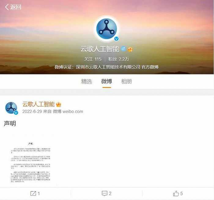 深圳云歌可以说是富二代,在一种大佬的托举下,运营的怎么样?在云歌的官方微博上,可以看到最新的动态,是一则声明,来自2022年6月29日,声明称:我司于6月16日接到深圳市公安局南山分局的《责令限期改正通知书》后,公司已经按照监管部门指示,在最短时间内整改完毕,并提交《隐患清零确认书》。