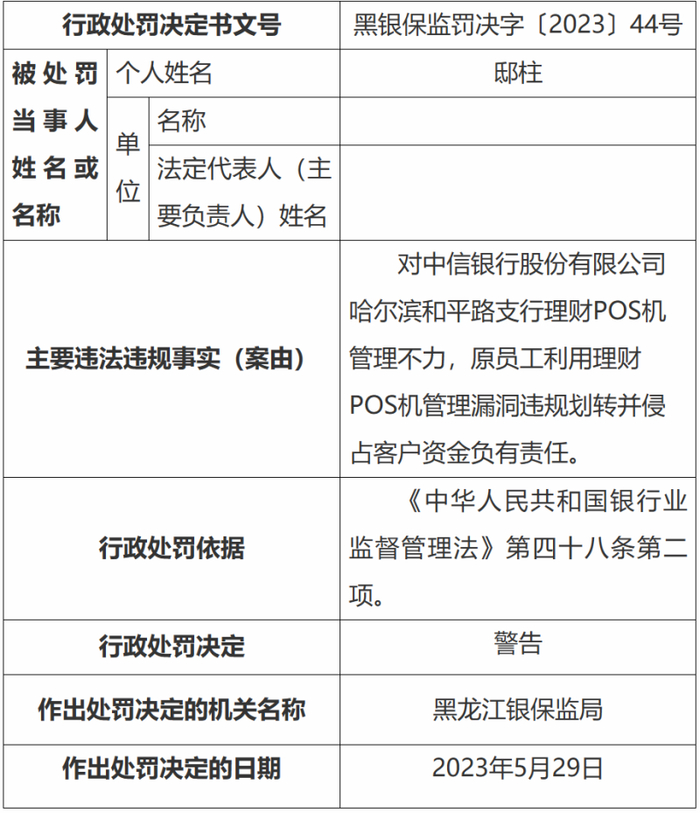 6月5日,针对理财POS机管理不力,黑龙江银保监局又开出一张罚单剑指中信银行。