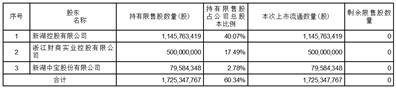 公司发行股份购买资产交易对手方中,新湖控股和新湖中宝取得的公司1,725,347,767股股份自该股份发行结束之日起36个月内不得转让;其余14名交易对方取得的公司488,882,696股股份自股份发行结束之日起12个月内不得转让,已于2021年6月9日解除限售并上市流通,具体内容详见公司于2021年6月4日披露的《湘财股份关于发行股份购买资产并募集配套资金暨关联交易之部分限售股解禁并上市流通的公告》(公告编号:临2021-046)。