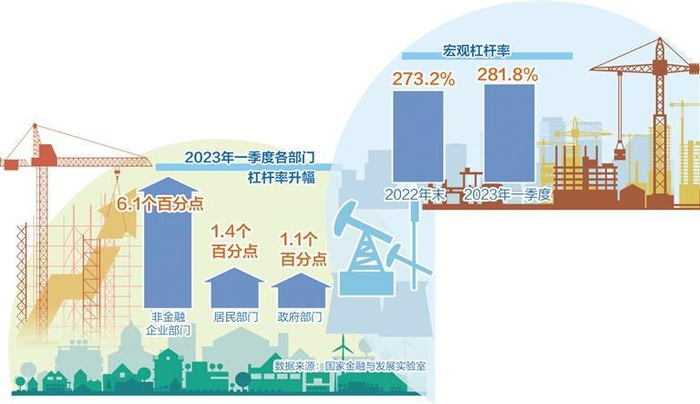 近日,国家金融与发展实验室发布的宏观杠杆率季报(以下简称“报告”)显示,2023年一季度宏观杠杆率从2022年末的273.2%上升至281.8%,共上升了8.6个百分点,升幅明显。其中,非金融企业杠杆率创新高,居民部门杠杆率重拾上升趋势,政府杠杆率升幅较小。