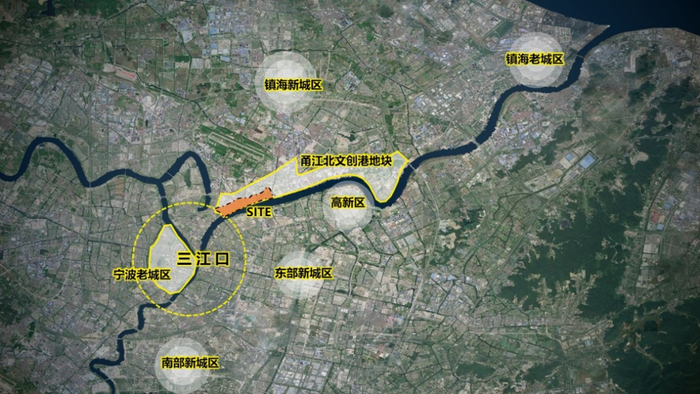 文创港所在的甬江北岸,一面接壤正三江口,一面连接“下一个十年向东”的甬江科创区,正是“三江时代”与“甬江时代”的地理连接点,也是传统与未来相遇的“高光引力场”。