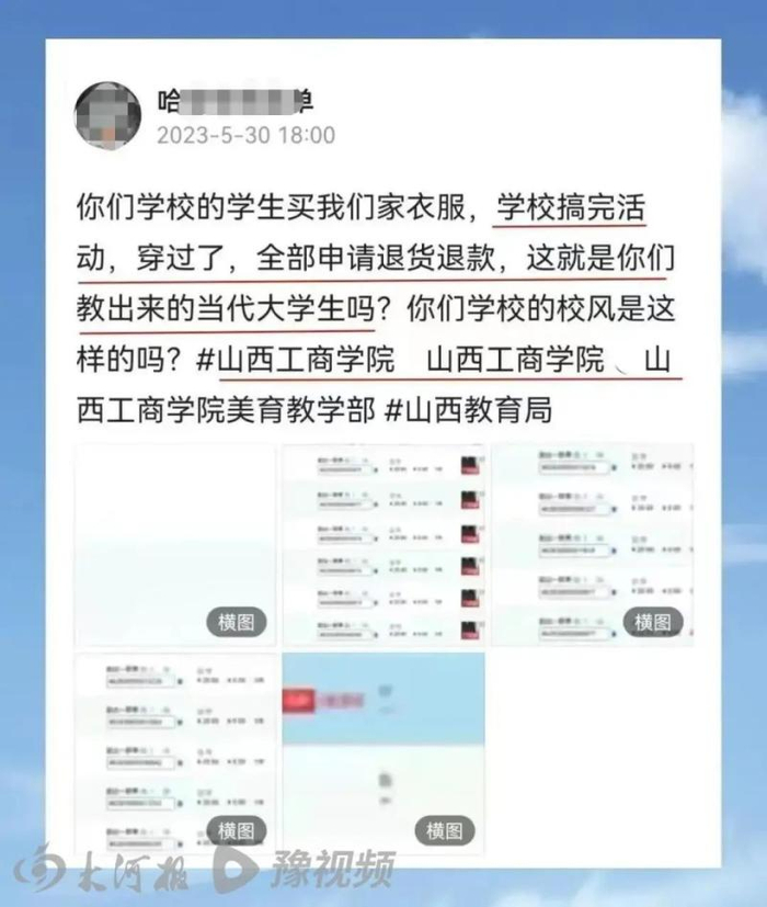 近日,自称是网店老板的网友@哈**单发文并晒出订单截图,称山西工商学院学生购买约43单文化衫,疑似40名学生在演出结束后集体退货。网店老板发文被网友转发,引发关注。
