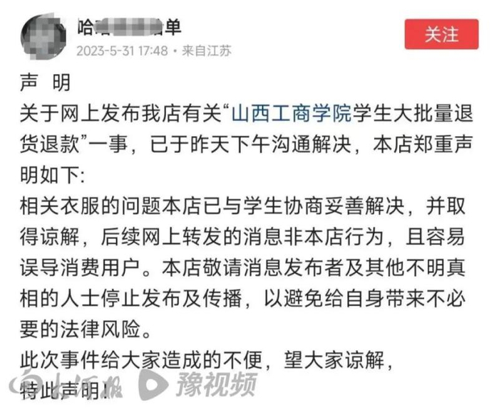 网店老板晒出的截图显示,退单地址显示为山西工商学院,单价20元左右,款式“红色龙 中国”。6月4日,大河报·豫视频记者注意到,该网店老板5月31日发布的动态称问题已解决,动态全文:“谢谢大家的关心。学校管事的老师也联系过我了,已经和平解决了。再次感谢大家!感谢大家,谢谢。”在评论区,该网店老板介绍了事情经过。5月30日下午,网店老板得知店铺收到大批量退货,这些衣服有穿过、洗过的痕迹,会影响二次销售。随即,网店老板尝试联系退货的学生,无人接听电话,老板便尝试联系学校,也没能联系上。接着,老板联系一名没退单的学生,该学生接听了电话,并答应帮忙联系其他学生。当天晚上9点,该学生将衣服退款打给网店老板并道歉。网店老板答应删除相关发文,并将衣服免邮发回。5月31日,山西工商学院一名老师给网店老板致歉,网店老板在社交平台发布相关声明。