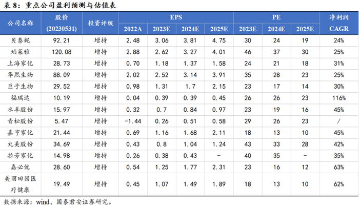 我们认为渠道红利过后未来国货美妆公司将沿产品升级-品牌化-集团化的路径成长,需要关注各公司对细分行业需求的快速反馈、自身产品洞察/营销/渠道的能力、以及组织架构及执行力等管理要素的建设。建议增持:1)线上数据强劲,预计业绩持续向好的珀莱雅、巨子生物、丸美股份,以及当下估值较低、有望边际改善的水羊股份、福瑞达。2)预期触底,后续有望迎来拐点的贝泰妮、上海家化、华熙生物等。受益标的:上美股份。