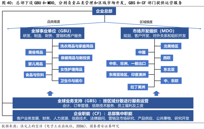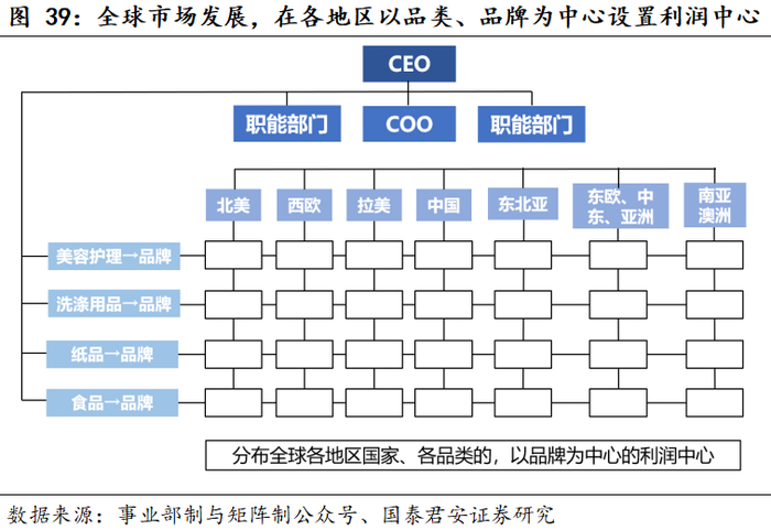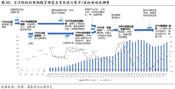 不同组织架构具备不同的优点,需根据市场环境和公司目标动态调整,决定放权和收权。权限下放(典型是多利润中心的事业部架构)是提高对外部市场反馈效率的重要手段,利于业务快速扩张,但弊端是不利于内部协同、且过细的拆分有可能产生组织冗余及内耗;权责集中(典型是中台控制)的优势是利于统一内部资源调度、提高一致性,利于公司战略自上而下的执行,但弊端是对外部变化反应速度慢。宝洁组织架构演变先随着业务变多逐步细化扩张、权力下放,然后为了避免内耗和整合精简架构:随品牌增多1931年设置品牌经理(扩);二战后随国际化形成区域-品牌矩阵型架构(扩);1987年应对品牌间内耗设置品类经理协同管理品牌(收);90s形成多利润中心模式(扩);1998年“2005专案改革”设置全球事业单位GBU从品牌建设维度进行各区域控制(收);2000年继续推行专案改革架构并精简GBU(收);2019年为加强区域市场竞争效率进行权限下放(放)。